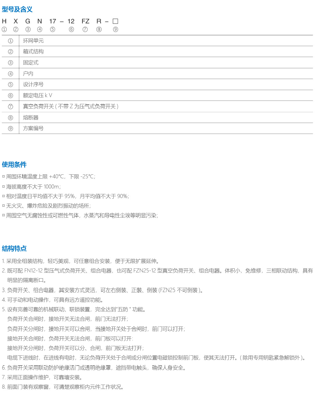 HXGN17-12型箱型固定式金属封闭开关设备(简称环网柜),额定电压12kV.额定频率50Hz的交流高压成套设备装置,主要用于相交流环网,终端配电网和工业用电设备,起接受、分配电能和保护等作用,它也适于装入箱式变电站。
