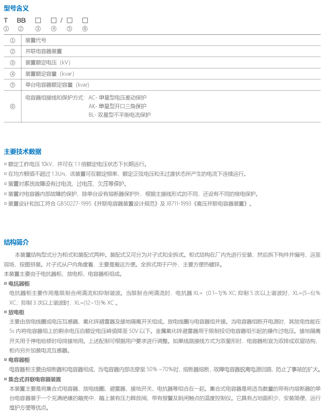 TBB系列高压并联电容器装置(以下简称装置)适用于交流50HZ、三相10kV电力系列中,用于提高功率因素和调整网路电压,从而提高供电设备有功输出和减少线路损耗。本装置为户内(外)式。