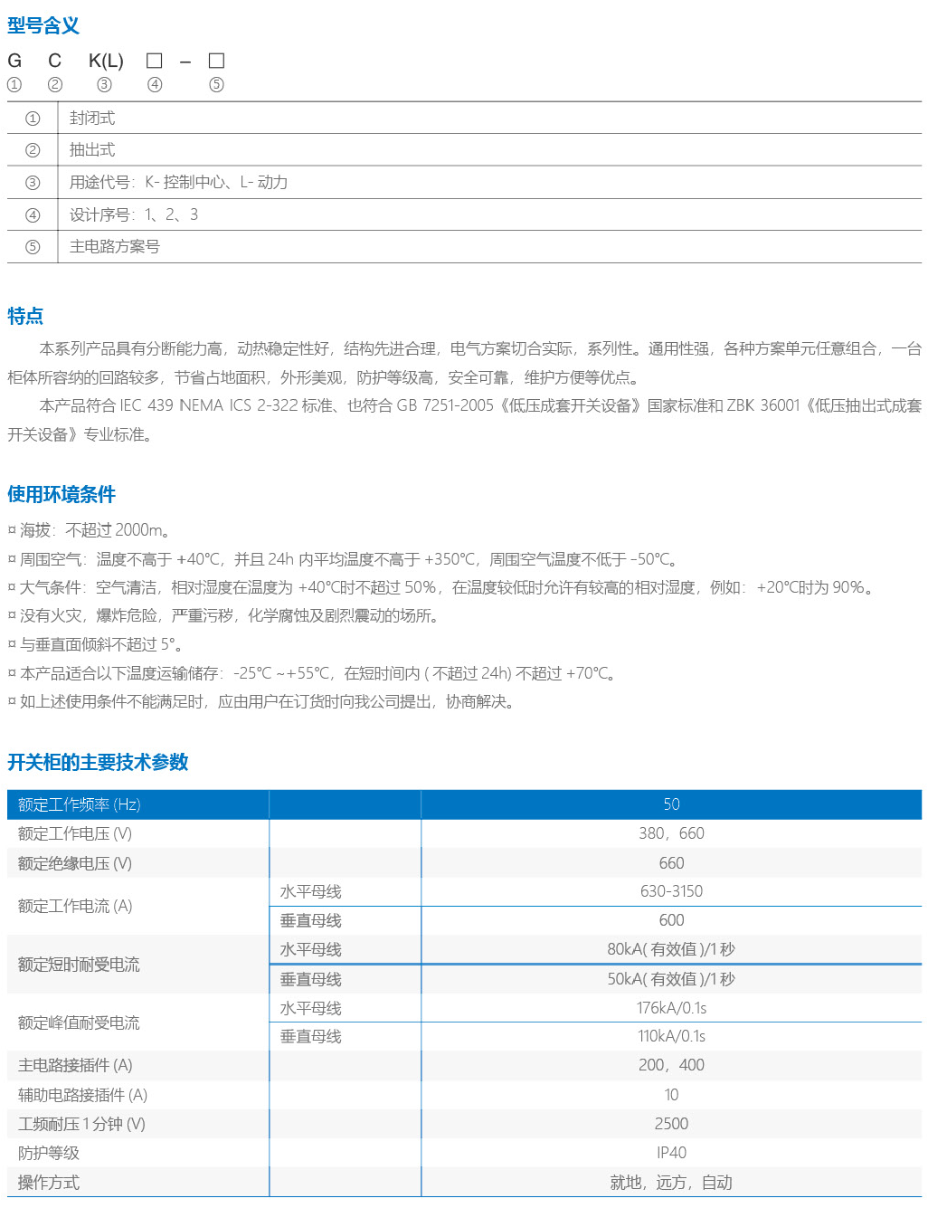 GCK低压抽出式开关柜由动力配电中心(PC)柜和电动机控制中心(MCC) =部分组成,适用于发电厂、变电站、工矿企业等电力用户作为交流50Hz,最大工作电压至660V,最大工作电流至3150A的配电系统中,作为动力配电、电动机控制及照明等配电设备的电能转换分配控制之用。